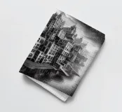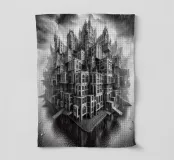 Una composizione surreale in bianco e nero con un'imponente struttura architettonica di ispirazione gotica circondata da acque ferme sotto una forte pioggia. L'illuminazione drammatica e il design intricato evocano un'atmosfera di struggente bellezza.