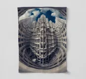 Una prospettiva fisheye surreale che mostra una torreggiante architettura gotica futuristica con dettagli intricati e motivi simmetrici, sullo sfondo di un cielo blu vibrante con nuvole drammatiche. L'immagine evoca la modernità mescolata a elementi di design classico.