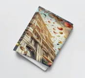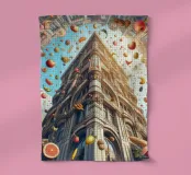 Una stravagante rappresentazione di un edificio storico con dettagli intricati circondato da un cielo vibrante pieno di frutta e verdura galleggianti. La composizione surreale fonde architettura e fantasia per una visione creativa e colorata.