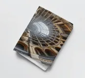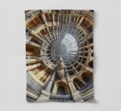 Questa immagine mostra un'intricata architettura circolare con colonne di pietra ornate, una statua centrale e un soffitto di vetro. La prospettiva surreale crea un effetto tunnel, attirando lo sguardo verso il centro della composizione.