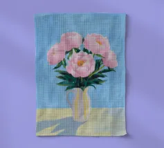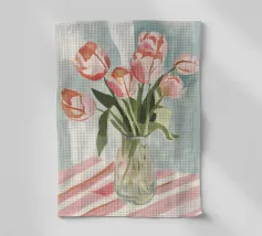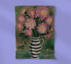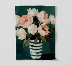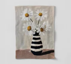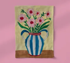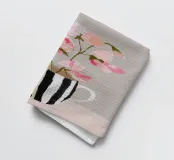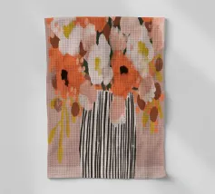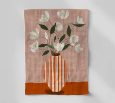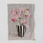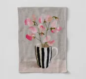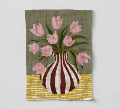 Questa illustrazione minimalista mostra un'elegante tazza di ceramica a righe bianche e nere, circondata da fiori rosa e foglie verdi. Sullo sfondo beige, l'allegro bouquet di fiori irradia leggerezza estiva e porta la freschezza botanica in ogni stanza!
