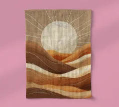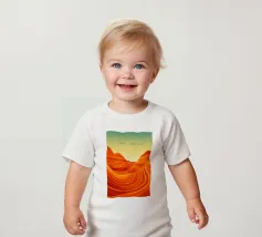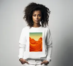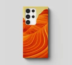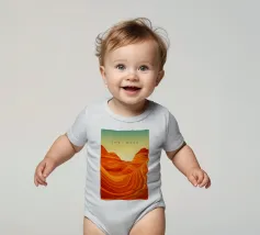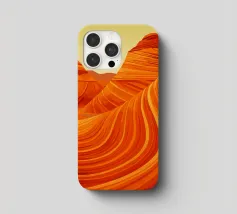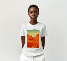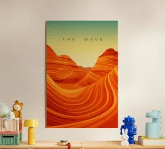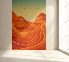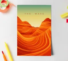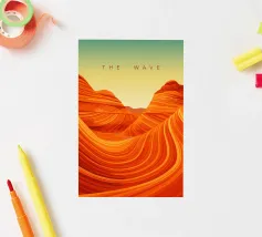 Disegno di viaggio minimalista e decorativo con "The Wave", la colorata formazione rocciosa sulle pendici del Coyote Buttes in Arizona, USA. Un disegno per le vacanze estive per tutti coloro che amano andare in vacanza nei parchi nazionali degli Stati Uniti e trovano bella questa natura e il paesaggio rossastro.