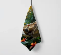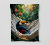 Con il suo iconico becco e la sua posa rilassata, questo tucano sembra nato per la vita sull'amaca. Porta colore e calma, sia che lo appendiate in giardino che in un angolo soleggiato. Una stampa estiva che ricorda che anche il dolce far niente è un talento. Questa stampa fa parte della serie "Jungle Hammock Tales" - relax estivo con una strizzatina d'occhio. Questa illustrazione digitale è stata creata in stile fotorealistico, con un occhio di riguardo per la luce, i dettagli e l'atmosfera. Visualizzata da Trinkets NL Design Studio utilizzando l'AI.