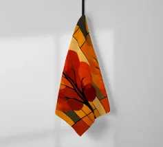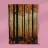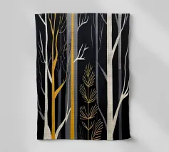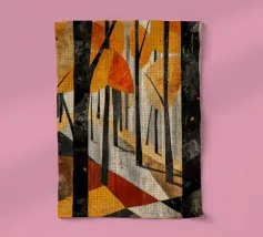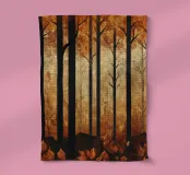 Il dipinto digitale di una foresta autunnale presenta sagome scure di alberi su uno sfondo caldo e dorato. L'opera d'arte testurizzata mostra un fogliame dettagliato nei toni dell'arancione e del marrone, creando una scena di bosco serena e suggestiva.