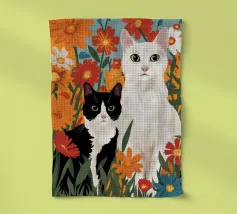 Un'affascinante raffigurazione di un gatto bianco e nero, probabilmente un gatto Tuxedo, seduto serenamente su un muro o un gradino di pietra danneggiato dalle intemperie. Il morbido fogliame verde e i delicati fiori rossi fanno da sfondo alla natura.