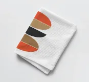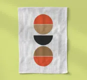 Due serie di semicerchi sono impilati verticalmente, ciascuno con colori contrastanti come l'arancione, il beige e il nero, creando motivi geometrici. La simmetria e il contrasto cromatico evocano un senso di equilibrio e di design moderno.