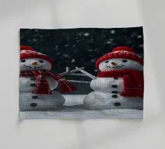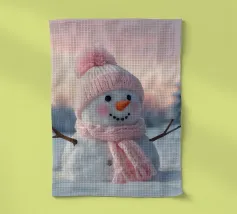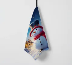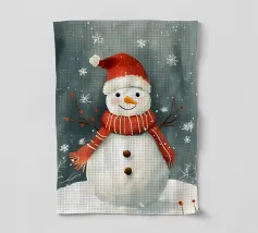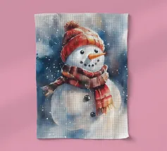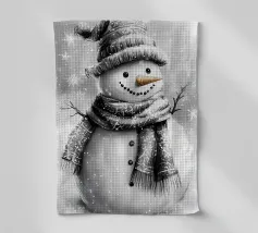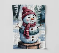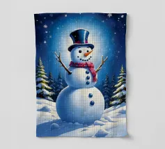 Un pupazzo di neve adornato con un cappello e una sciarpa si gode la serena bellezza di una foresta innevata al chiaro di luna, circondato da fiocchi di neve che cadono.