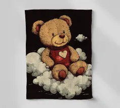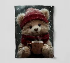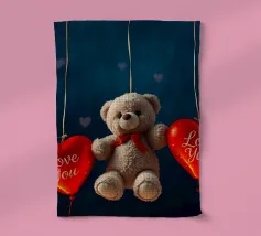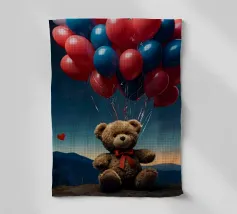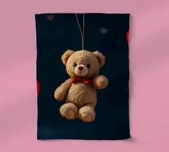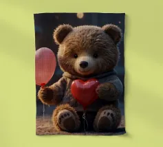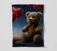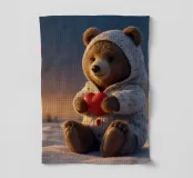 Un simpatico orsacchiotto vestito con un'accogliente felpa con cappuccio siede nella neve, tenendo gioiosamente un cuore rosso mentre un palloncino si muove nell'aria fresca della sera sotto un tramonto colorato.