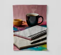 Un vivace spazio di lavoro mostra un quaderno a righe ornato da un fiore rosa, circondato da carte colorate e materiale artistico, che invita alla creatività e all'ispirazione.