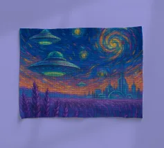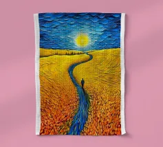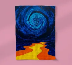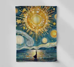 Questa accattivante opera d'arte ritrae una figura solitaria in piedi davanti a un vortice radioso, che mescola blu profondi con una vibrante luce dorata. I tratti pittorici creano un senso ipnotico di movimento e mistero, invitando lo spettatore a un viaggio onirico. Con il suo bagliore atmosferico e l'atmosfera contemplativa, questo disegno si rivolge agli appassionati di paesaggi surreali, arte simbolica e narrazione emotiva. Un pezzo di grande effetto che aggiunge profondità, intrigo e colore agli interni moderni, agli studi creativi o agli spazi di meditazione. Lasciate che la vostra parete racconti una storia di meraviglia.