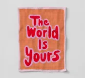 "Il mondo è tuo!" - Un avventuroso motivo estivo nelle vivaci tonalità del rosa, del rosso e dell'arancione. Questo disegno tipografico ispira viaggi ed esplorazioni, mentre il carattere audace incarna libertà e possibilità.