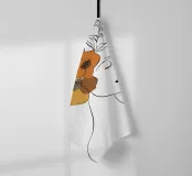 Un disegno al tratto minimalista raffigura il profilo di una donna dall'espressione serena. I suoi capelli sono ornati da grandi fiori stilizzati di colore arancione e giallo e da foglie delicate.