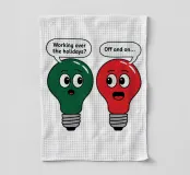 Due lampadine dei cartoni animati, una verde e una rossa, si confrontano in una conversazione scherzosa sul lavoro durante le vacanze. La lampadina verde pone la domanda, mentre la lampadina rossa risponde con umorismo.