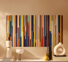 Questa opera d'arte presenta una vivace composizione di colori vivaci, tra cui il rosso, il blu, il giallo e l'arancione, creando un'atmosfera dinamica ed energica ideale per sfondi digitali e design.
