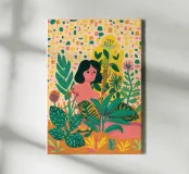 Un ritratto di profilo di donna, con i capelli e lo sfondo riempiti da un vivace motivo floreale astratto. L'opera è una rappresentazione creativa, bella e fantasiosa di una mente che fiorisce di idee.