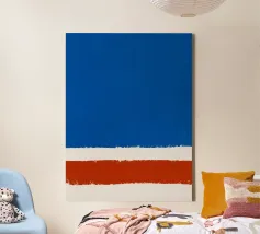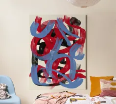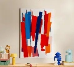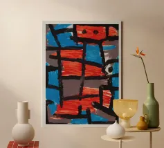 Audaci blocchi di rosso e blu sono divisi da tratti verticali in bianco e nero, in uno stile astratto e minimalista. L'applicazione spessa della vernice e il netto contrasto tra i colori conferiscono all'opera una sensazione dinamica ed espressiva.