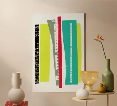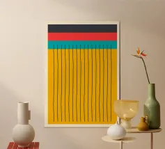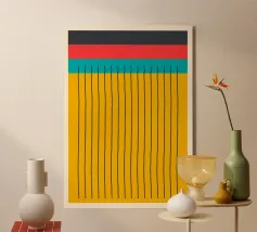 Un poster astratto minimalista caratterizzato da un blocco dominante di un ricco giallo senape, sovrapposto a una serie di linee verticali volutamente irregolari, disegnate a mano in carboncino scuro. Questa sezione principale è sormontata da una barra orizzontale a blocchi di colore composta da tre strisce distinte: carbone scuro, rosso vibrante e verde acqua intenso. La semplice composizione contrappone la precisione geometrica (i blocchi di colore) all'irregolarità organica (le linee), creando un'estetica unica da Mid-Century Modern. Questo download digitale di alta qualità (7000x5000 pixel, 300 dpi) offre una stampa artistica nitida e moderna.