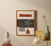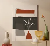Linee astratte e blocchi di colori tenui creano una composizione moderna dall'estetica minimalista. La forma stilizzata di una pianta e quella semplice di un vaso aggiungono elementi organici, in contrasto con le forme geometriche.