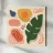 Una composizione astratta con una foglia di monstera, una papaya a fette e altre forme organiche in una tavolozza di colori moderni e tenui.