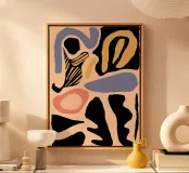Una composizione astratta minimalista di forme organiche in nero, blu e beige, che suggerisce un volto o una figura decostruita. Lo stile è moderno e sofisticato.