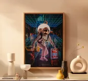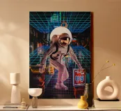L'immagine mostra un astronauta con una tuta spaziale bianca che sembra camminare in una strada di Tokyo illuminata al neon. Il casco dell'astronauta riflette le luci circostanti. Una sorgente luminosa circolare è posizionata dietro l'astronauta. Una griglia retrò blu e rosa aggiunge un'estetica futuristica e cyberpunk alla scena.
