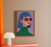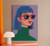 Un ritratto audace ed elegante di una donna con capelli corti e blu, che indossa un dolcevita verde e occhiali da sole cat eye rossi e vivaci. La sua espressione sicura e la tavolozza di colori freddi creano un look moderno e tagliente.