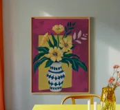 Una classica natura morta di un bouquet colorato con fiori gialli, rosa e viola disposti in un vaso ornato con motivi blu e bianchi. L'opera è collocata su uno sfondo viola scuro che fa risaltare i colori.