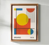 Un poster digitale dinamico e classico che celebra la fondazione del Bauhaus nel 1919. La composizione presenta una disposizione asimmetrica di grandi forme geometriche - cerchi e rettangoli - nell'iconica tavolozza di colori di ispirazione primaria: rosso-arancio, blu e giallo. Le spesse linee nere impongono una struttura chiara, mentre le sottili linee verticali e orizzontali aggiungono profondità e consistenza alle sezioni del disegno. Questo pezzo è un potente esempio di arte modernista minimalista e di ispirazione De Stijl. Questo download digitale di alta qualità vanta 7000x5000 pixel a 300 dpi, garantendo una chiarezza eccezionale e una qualità di stampa superiore.