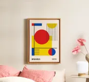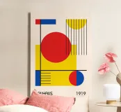 Un poster digitale dinamico e classico che celebra la fondazione del Bauhaus nel 1919. La composizione presenta una disposizione asimmetrica di grandi forme geometriche - cerchi e rettangoli - nell'iconica tavolozza di colori primari rosso, blu e giallo. Le spesse linee nere impongono una struttura chiara, mentre le sottili linee verticali e orizzontali aggiungono profondità e consistenza alle sezioni del disegno. Quest'opera è un potente esempio di arte modernista minimalista e ispirata a De Stijl. Questo download digitale di alta qualità vanta 7000x5000 pixel a 300 dpi, garantendo una chiarezza eccezionale e una qualità di stampa superiore.