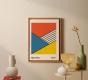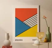 Un poster digitale dinamico che celebra la fondazione del Bauhaus nel 1919. La composizione è un audace blocco di colori astratto, frammentato da linee diagonali nette in tre sezioni principali: rosso-arancio, blu profondo e giallo vibrante. Una sezione di strisce orizzontali bianche con contorni neri introduce una texture ritmica e complessa. Questo pezzo incarna l'estetica funzionalista e l'attenzione geometrica del Modernismo minimalista. Questo download digitale di alta qualità vanta 7000x5000 pixel a 300 dpi, garantendo una chiarezza eccezionale e una qualità di stampa superiore.