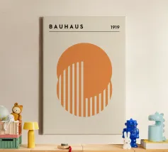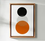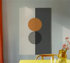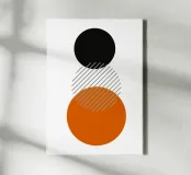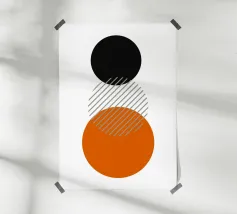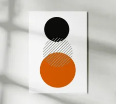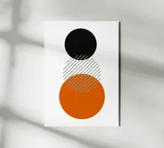 Un poster astratto di ispirazione Bauhaus di grande impatto, caratterizzato da un accatastamento verticale e pulito di tre grandi cerchi. Il cerchio superiore è nero, quello inferiore è un audace arancione bruciato/terracotta. La sezione centrale, che rappresenta la sovrapposizione, è un cerchio pulito con strisce diagonali grigie, che si estende leggermente sulla sfera arancione sottostante. Questo disegno è un superbo studio di colori, motivi e sovrapposizioni geometriche, che incarna perfettamente il principio modernista di forma e contrasto. Questa stampa digitale ad alta risoluzione (7000x5000 pixel, 300 dpi) assicura linee nitide e blocchi di colore vividi, rendendola un'opera elega