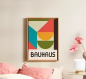 Celebrate la vibrante geometria dell'epoca Bauhaus con questo splendido poster astratto a blocchi di colore. La composizione presenta un gioco di forme audaci, tra cui triangoli e semicerchi, in una sofisticata tavolozza di verde acqua, rosso corallo, giallo senape e verde oliva, su uno sfondo color crema. Una barra marrone scuro sulla destra aggiunge un contrasto sorprendente. L'iconica tipografia "BAUHAUS" caratterizza la parte inferiore. Questo pezzo è una perfetta fusione di fascino retrò e stile contemporaneo, ideale per un salotto o un ufficio. Riceverete un file digitale di alta qualità (7000x5000 pixel, 300 dpi) che vi garantirà una qualità superio
