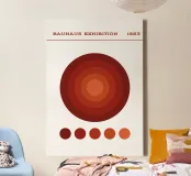 Un magistrale manifesto della mostra Bauhaus del 1923, caratterizzato da uno studio preciso e avvincente della forma concentrica e del colore. Il disegno è dominato da un grande bersaglio centrale composto da cinque cerchi concentrici, che illustrano un bellissimo gradiente di colore monocromatico. Le tonalità passano da una terra d'ombra profonda e bruciata all'esterno a un corallo/pesca chiaro e luminoso al centro. La tavolozza dei colori è ulteriormente definita da cinque piccoli cerchi alla base. Il testo "BAUHAUS EXHIBITION 1923" è inciso in alto. Questa stampa digitale ad alta risoluzione (7000x5000 pixel, 300 dpi) offre una colorazione impeccabile.