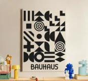 Un poster astratto in bianco e nero, ricco di immagini, caratterizzato da una composizione densa, apparentemente casuale ma strutturata di elementi geometrici che si intersecano. Il disegno è pieno di forme diverse, tra cui quadrati pieni, triangoli, semicerchi, anelli, strisce e cerchi concentrici. Questa complessità celebra le forme fondamentali e i principi di design modulare della scuola Bauhaus e del modernismo astratto. La parola "BAUHAUS" è centrata in grassetto in basso, in un carattere sans-serif pesante e arrotondato. Questo download digitale ad alta risoluzione (7000x5000 pixel, 300 dpi) garantisce una riproduzione nitida e di qualità museale.