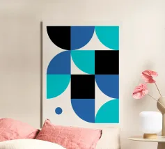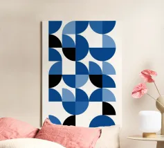 Questo design ispirato al Bauhaus è caratterizzato da forme geometriche chiare in un blu armonioso su uno sfondo neutro. La combinazione di semicerchi e quadrati crea una composizione dinamica ma minimalista. Questo disegno è perfetto per gli amanti dell'arte moderna che desiderano creare accenti semplici ed eleganti nella propria casa. Ideale per murales, tazze, cuscini e molto altro.