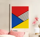 Un poster astratto in stile Bauhaus potente e sorprendente, definito da blocchi di colore audaci e diagonali. La composizione presenta i tre colori primari - rosso vivo, blu elettrico e giallo solare - che si incontrano al centro. Una sezione distintiva di strisce diagonali bianche e nere aggiunge movimento dinamico e consistenza ai campi di colore altrimenti piatti. Questa stampa è la quintessenza della purezza geometrica modernista. Il poster digitale è fornito con una risoluzione premium di 7000x5000 pixel, 300 dpi, che garantisce una qualità superiore per una stampa artistica di grande impatto.