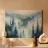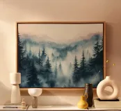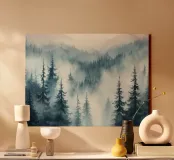 Una mistica foresta mattutina con abeti e colline nebbiose si dispiega in morbide tonalità olivastre, mentre il paesaggio montano risplende in un incantevole dipinto ad acquerello. Ideale per gli amanti della natura!