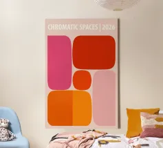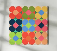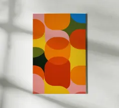 Un motivo astratto di pop art dal fascino anni '70 mostra campi colorati e motivi in arancione-rosa-verde. La struttura colorata incontra illustrazioni moderne e giocose nel design grafico. Vivace e strutturato, con un'estetica chiara e geometrica.