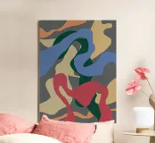 Forme astratte di vari colori si intrecciano su uno sfondo tenue. Le sfumature di blu, rosso e beige spiccano e creano un senso di movimento attraverso le loro forme fluide.