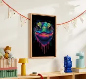 Un intenso ritratto di tartaruga che cattura lo sguardo con forti colori al neon. Il primo piano del muso dell'animale affascina con le tonalità brillanti del blu, del verde e del rosa, che confluiscono in un gradiente di colore artistico. Gli schizzi di colore e le gocce di vernice che scorrono rafforzano il carattere di street art dell'immagine. L'attenzione si concentra sui grandi occhi e sulle squame dettagliate, che conferiscono al motivo una profondità quasi vivida. Lo sfondo nero garantisce il massimo impatto cromatico e sottolinea con forza la composizione.