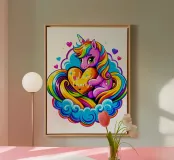 Questo adorabile unicorno, che risplende nei colori neon dell'arcobaleno, stringe un cuore stellato e fluttua su una soffice nuvola di stravagante felicità. Con i suoi grandi occhi scintillanti e una criniera che abbaglia in uno spettro di tonalità brillanti, questo disegno sembra una magica fuga in una terra dove i sogni diventano realtà. È perfetto per aggiungere una ventata di energia giocosa a qualsiasi spazio o oggetto che decora. Che siate giovani o giovani di cuore, questo allegro unicorno è qui per ricordarvi di abbracciare la magia che è in voi e di agire sempre con amore.