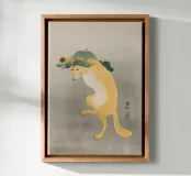 Questa incantevole stampa giapponese ukiyo-e cattura una scena stravagante e mistica. Una soffice volpe arancione è raffigurata in una posizione giocosa e danzante, con una grande zucca verde e delle foglie appoggiate sulla schiena. L'espressione maliziosa e la posa dinamica conferiscono all'opera un senso di vita e di folclore. Lo sfondo è di un grigio morbido e strutturato, che fa risaltare i colori vivaci della volpe e della zucca. Questa stampa digitale ad alta risoluzione (7000x5000 pixel, 300 dpi) mette in risalto i dettagli intricati e la natura umoristica di questa opera d'arte tradizionale giapponese, rendendola così un'opera d'arte.