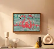 Stampa d'arte a parete di fenicotteri - Decorazioni geometriche tropicali Portate a casa vostra energia vibrante ed eleganza moderna con questa stampa artistica da parete di fenicotteri, che presenta due fenicotteri splendidamente dipinti a mano e reimmaginati attraverso un sorprendente motivo geometrico a rombi. L'opera d'arte originale è stata amorevolmente creata a mano ed è stata trasformata in una stampa di alta qualità, che vi permetterà di godere dei dettagli e della maestria nel vostro spazio. Perfetta per soggiorni, camere da letto, uffici o spazi creativi, questa opera d'arte di ispirazione tropicale combina il fascino giocoso dei fenicotteri con un tocco astratto contemporaneo.