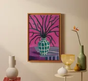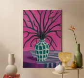 Una suggestiva illustrazione di rami scuri e spogli in un vaso a scacchi blu e bianchi, stagliati su un vibrante sfondo rosa fucsia.