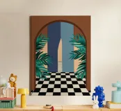 Illustrazione di un portale ad arco con pavimento a scacchi, che si apre sulla vista di un lussureggiante paradiso tropicale con palme. La scena è uno scorcio invitante e misterioso di una splendida fuga.