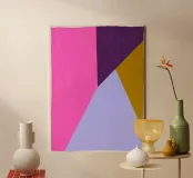 Una composizione astratta con audaci forme geometriche in rosa, viola, oro e azzurro. Il gioco di colori crea un'esperienza visiva dinamica.