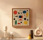 Un insieme di forme colorate, in particolare cerchi e linee, crea una composizione dinamica. L'uso di colori primari aggiunge un'atmosfera vibrante e moderna.