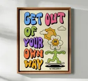 Liberatevi con questa stampa d'arte "Get Out Of Your Own Way". La frase d'impatto è resa con una tipografia audace e ondeggiante in vibranti tonalità di verde e viola, creando un effetto dinamico e quasi ipnotico. Le lettere si intrecciano con forme organiche giocose e sottili accenti di stelle, il tutto su uno sfondo morbido e complementare. Questo pezzo cattura un senso di psichedelia retro motivazionale, perfetto per ispirare l'azione e il miglioramento personale in qualsiasi spazio. Questa arte digitale di alta qualità è presentata in una straordinaria risoluzione di 7000x5000 pixel a 300 dpi, che garantisce dettagli nitidi e vi