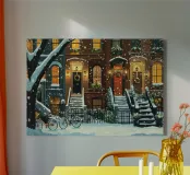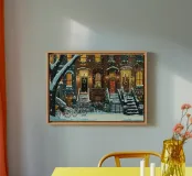 Entrate in un incantevole paese delle meraviglie invernale con questa toccante stampa d'arte digitale, che raffigura una fila di classiche case in brownstone splendidamente addobbate per la stagione natalizia. Ogni porta è ornata da una ghirlanda festosa e le finestre risplendono di luce calda, proiettando una luce accogliente sugli scalini e sulle ringhiere innevate. Fiocchi di neve fresca cadono delicatamente, aggiungendo un tocco di serenità all'idilliaca scena urbana, completata da biciclette innevate che riposano nelle vicinanze. Questo poster digitale di alta qualità, con una risoluzione di 7000x5000 pixel a 300 dpi, cattura i dettagli e l'atmosfera rassicurante di un festoso inverno.