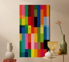 Un motivo geometrico composto da vari rettangoli, con sezioni definite da sfumature di grigio e strisce orizzontali in colori contrastanti come rosso, blu e verde. La disposizione crea un effetto visivo strutturato e vibrante, con i colori che formano una struttura a griglia.